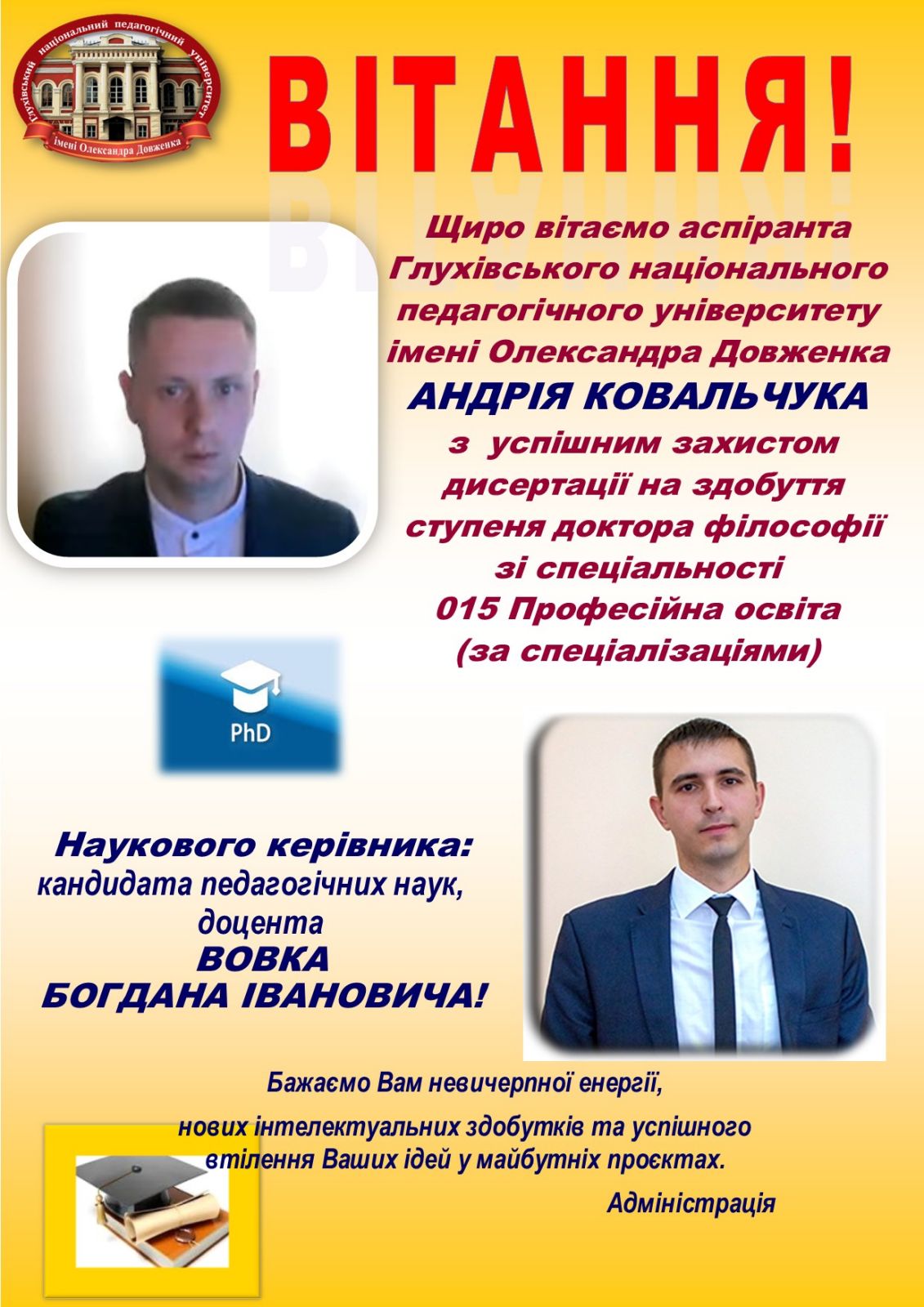 22 січня 2026 року відбувся захист дисертації аспіранта Глухівського національного педагогічного університету імені Олександра Довженка КОВАЛЬЧУКА Андрія на тему «Організаційно-педагогічні умови цифровізації фахової підготовки майбутніх педагогів професійного навчання» на здобуття ступеня доктора філософії зі спеціальності 015 Професійна освіта (за спеціалізаціями). Захист відбувся у Разовій СВР ДФ 56.146.027. Науковий керівник: кандидат педагогічних наук, доцент ВОВК Богдан Іванович.