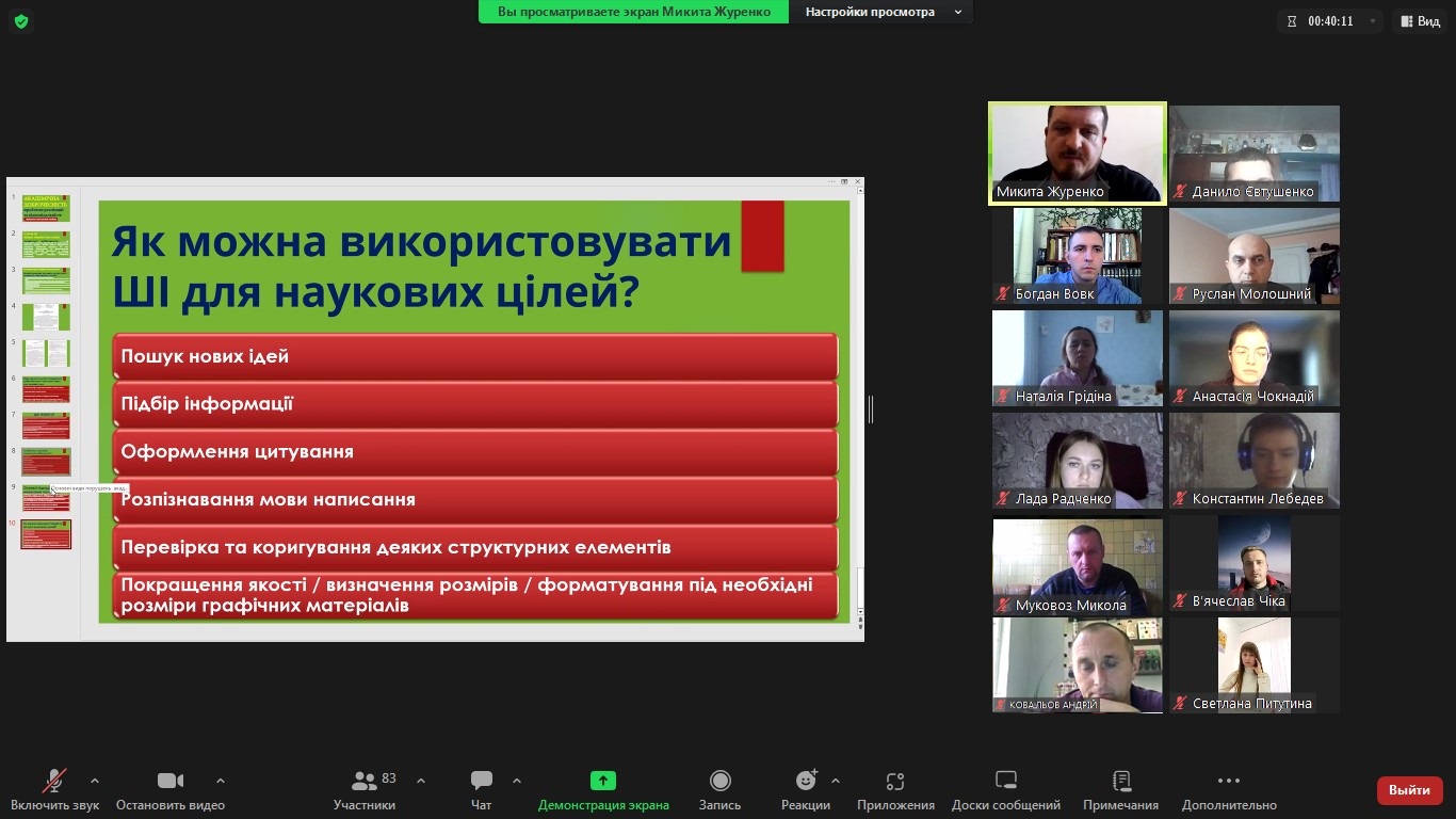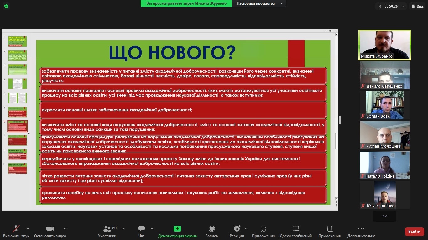 Також, детально було розглянуто основні види порушень (плагіат, фабрикація, обман, фальсифікація, хабар, корупція тощо) та можливі наслідки у вигляді академічної відповідальності.