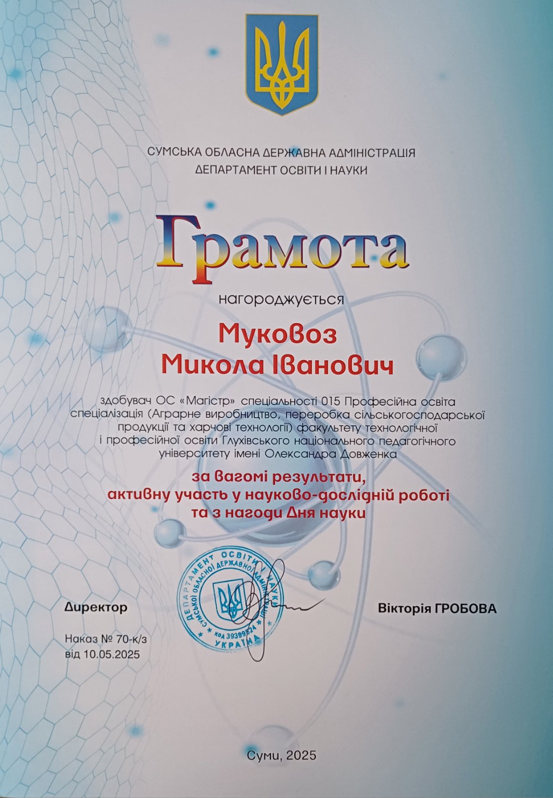 Щиро вітаємо здобувача освіти другого (магістерського) рівня вищої освіти спеціальності «Професійна освіта (Аграрне виробництво, переробка сільськогосподарської продукції та харчові технології)» Миколу Муковоза з отриманням Грамоти Департаменту освіти і науки Сумської обласної державної адміністрації!