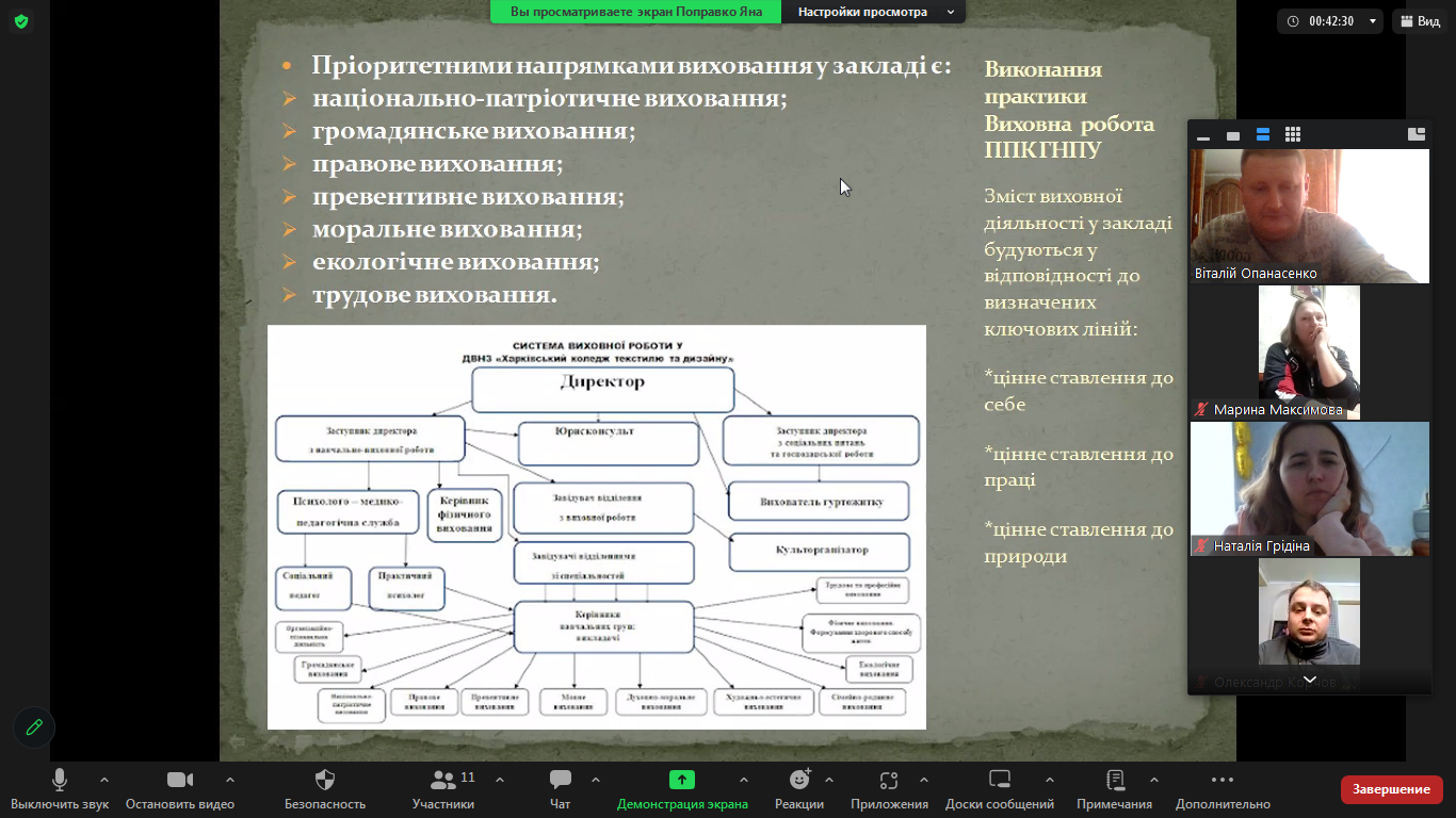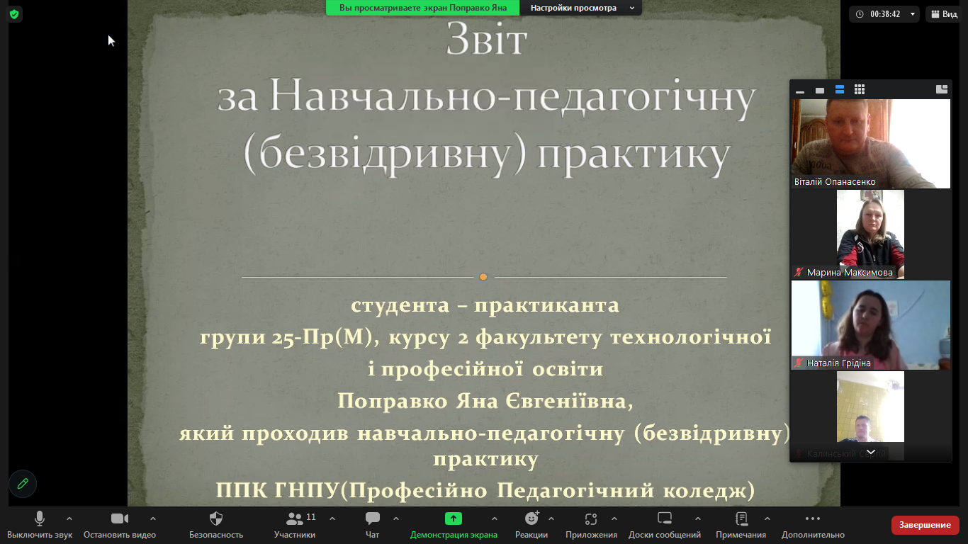 Відповідно до розпорядження №40 від 07.03.2024 року та №48 від 19.03.2024 року «Про педпрактику», за допомогою сервісу Zoom кафедрою професійної освіти та технологій сільськогосподарського виробництва було проведено підсумкові конференції з педагогічних практик для студентів 14-Пр(М), 25-Пр(М), 23-Пр(М), 34-Пр(М), 45-Пр(М) груп спеціальності 015 Професійна освіта (Аграрне виробництво, переробка сільськогосподарської продукції та харчові технології): «Навчально-педагогічна (безвідривна)», «Навчально-залікова (на робочому місці педагога професійного навчання)»; «Навчально-залікова (на робочому місці майстра виробничого навчання, педагога професійного навчання)».