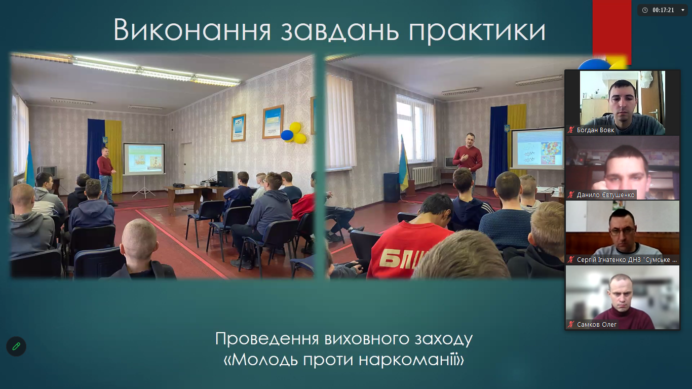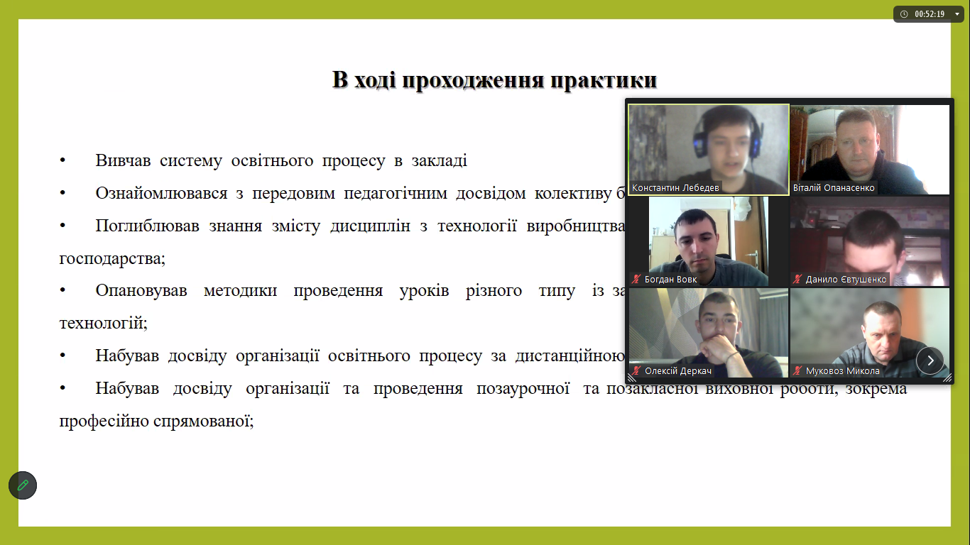 У процесі захисту звітів здобувачі освіти звітували про виконання завдань практики, умови її проходження, розкривали особливості організації освітнього процесу баз практик, ділились педагогічним досвідом викладачів спецдисциплін, який вони опанували під час проведення занять та виховних заходів.