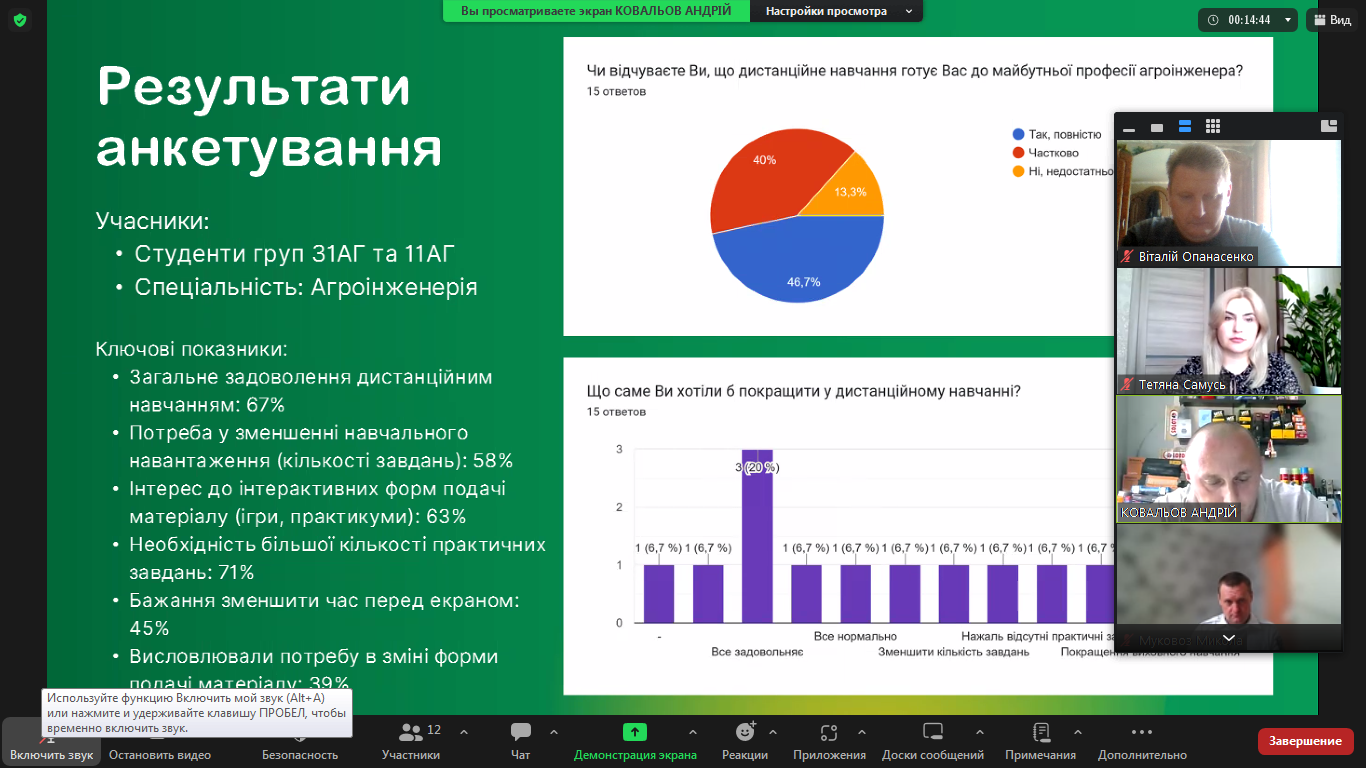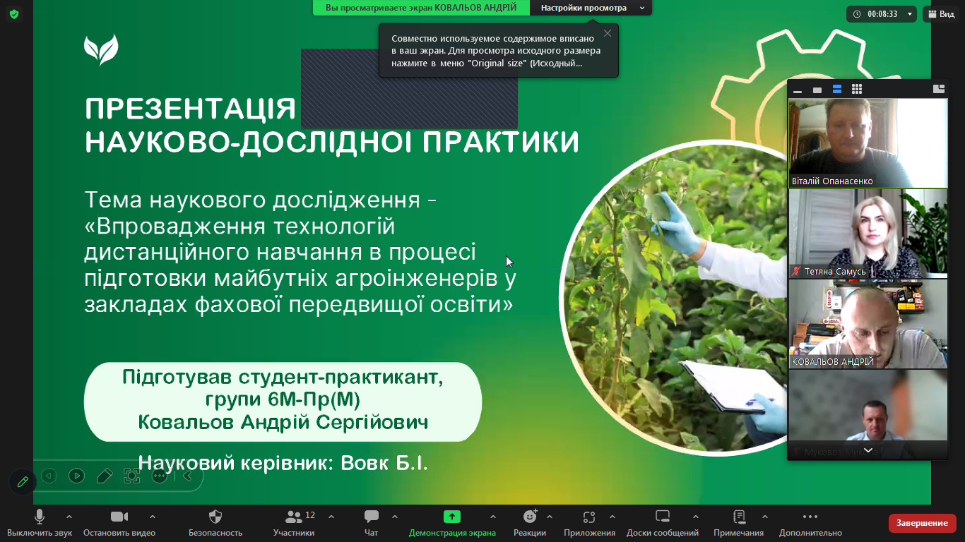 16 червня 2025 року за допомогою сервісу Zoom кафедрою професійної освіти та технологій сільськогосподарського виробництва було проведено підсумкову конференцію з захисту науково-дослідницької практики з написання магістерської роботи студентами 6М-Пр(М) групи, спеціальності А5 Професійна освіта (Аграрне виробництво, переробка сільськогосподарської продукції та харчові технології).