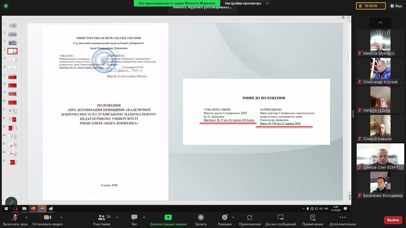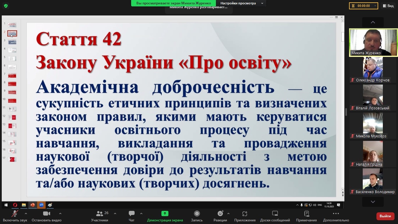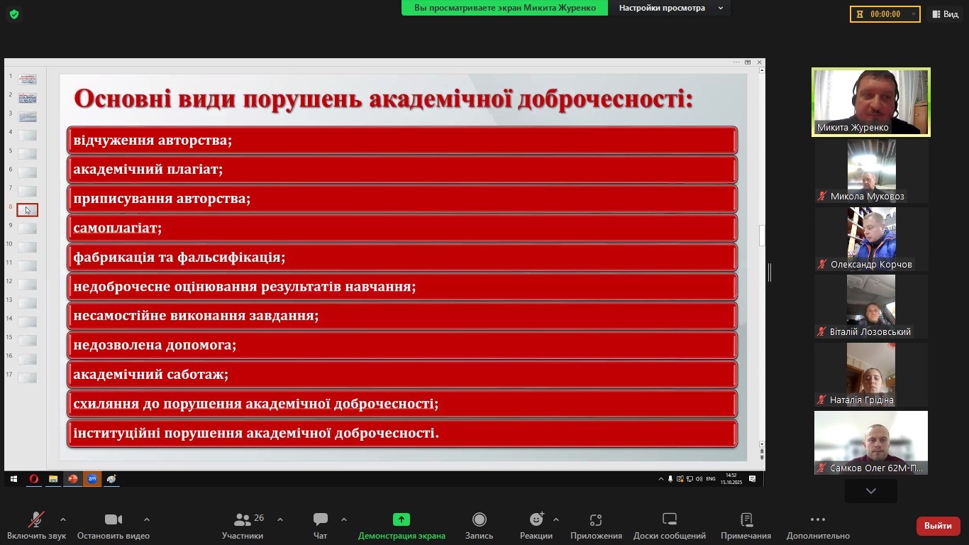 Вебінар провів Микита Журенко, який наголосив на важливості формування у здобувачів освіти відповідального ставлення до власних навчальних і наукових досягнень.