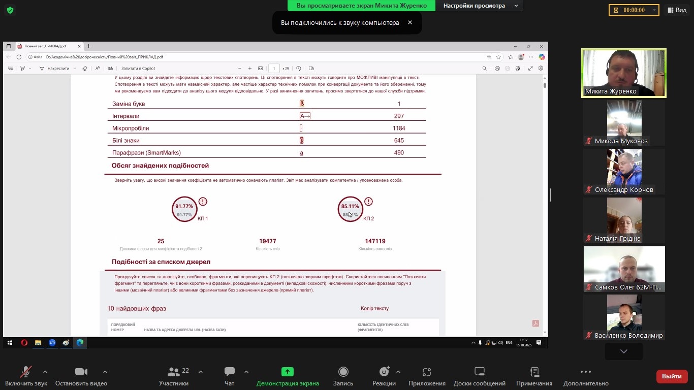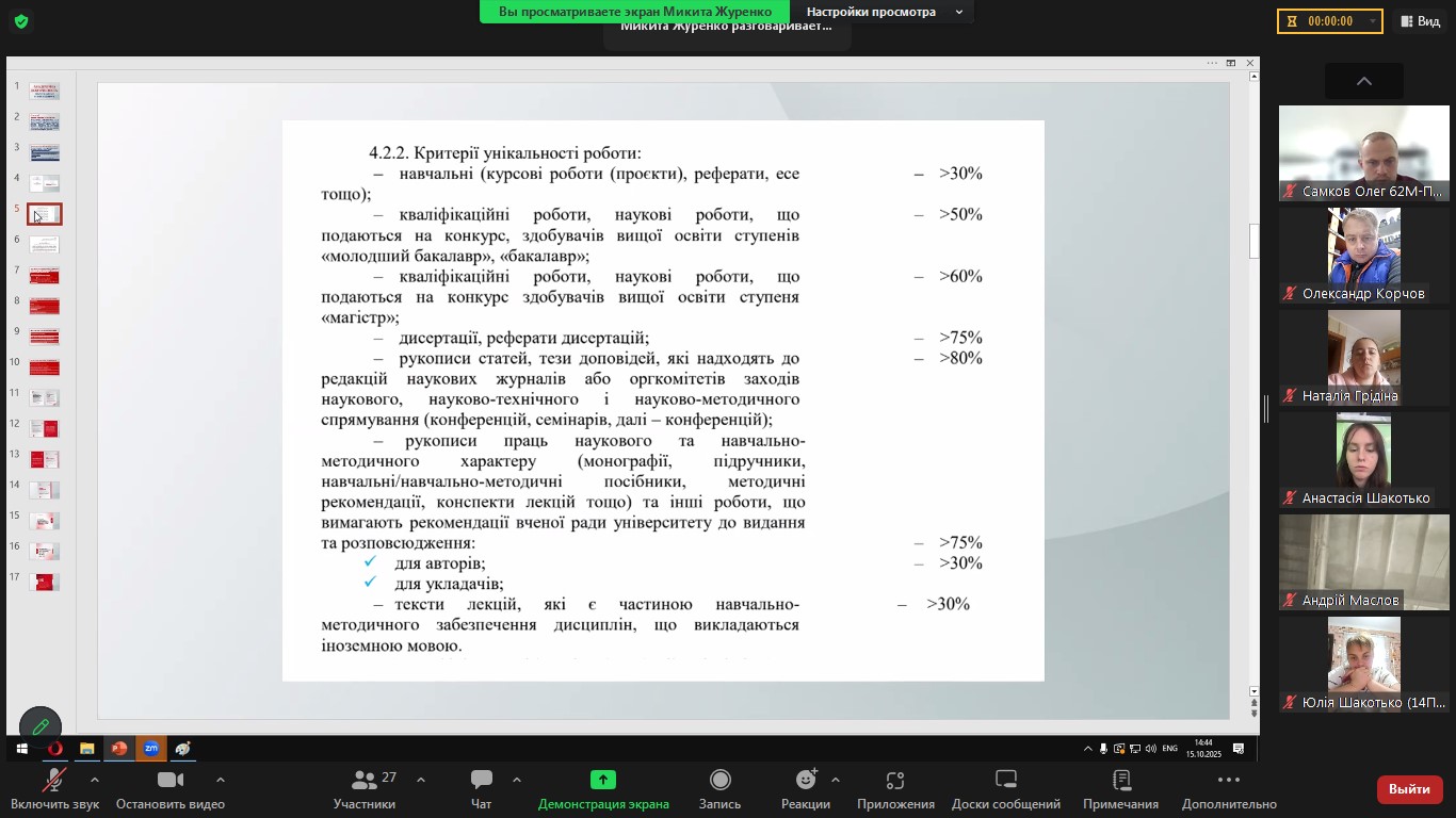 Учасники вебінару ознайомилися з основними нормативними документами, що регулюють академічну доброчесність в Україні, обговорили типові порушення, критерії унікальності наукових і навчальних робіт, а також механізми запобігання академічному плагіату.