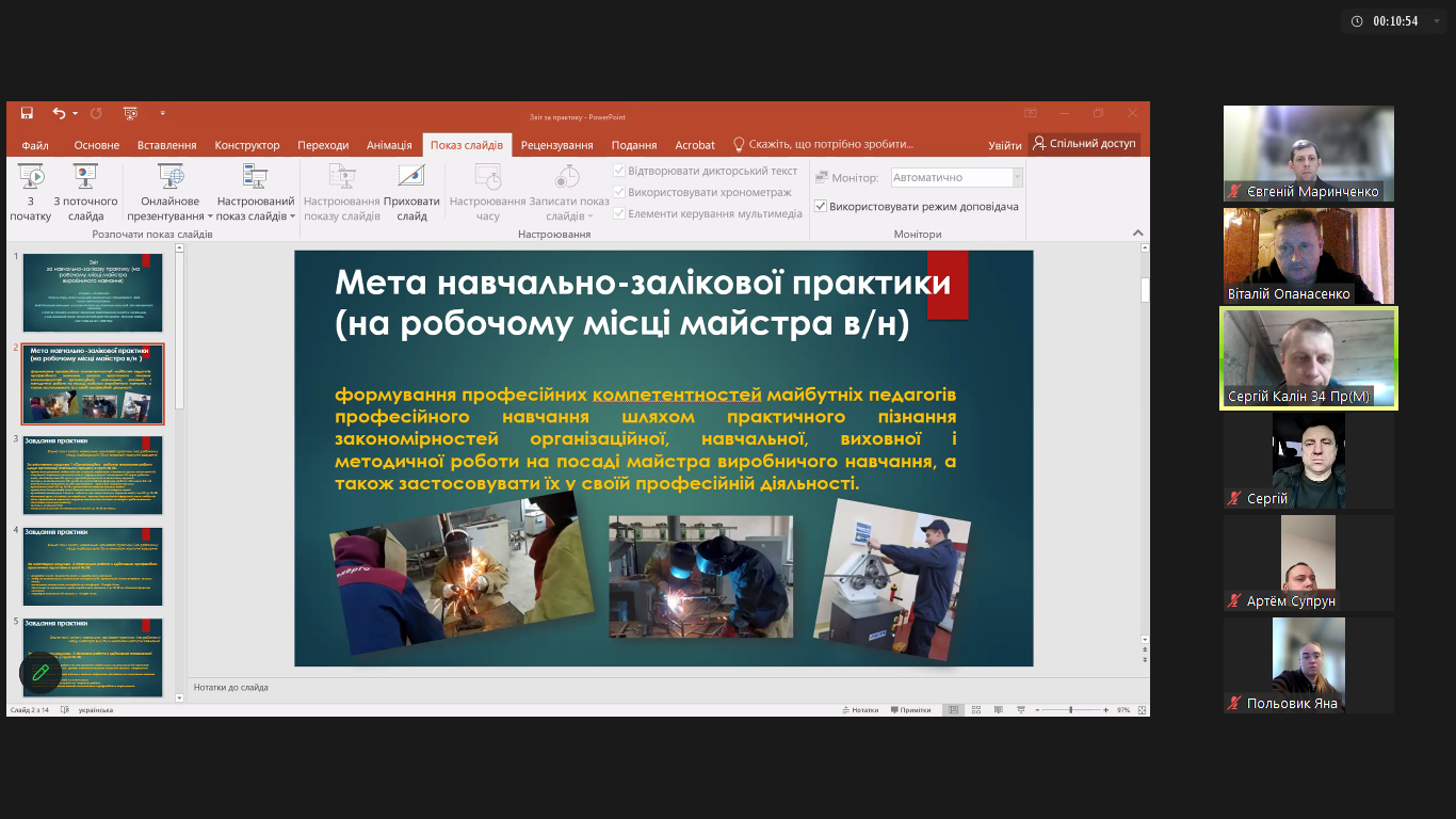 10 грудня відповідно до розпорядження №317 «Про педпрактику», у форматі відеоконференції, відбувся захист навчально-залікової практики на робочому місці майстра виробничого навчання студентами 34-Пр(М) та 45- Пр(М) груп. Практика тривала 03.11.2025 р. до 07.12.2025 р. у закладах професійної (професійно-технічної) та фахової передвищої освіти.