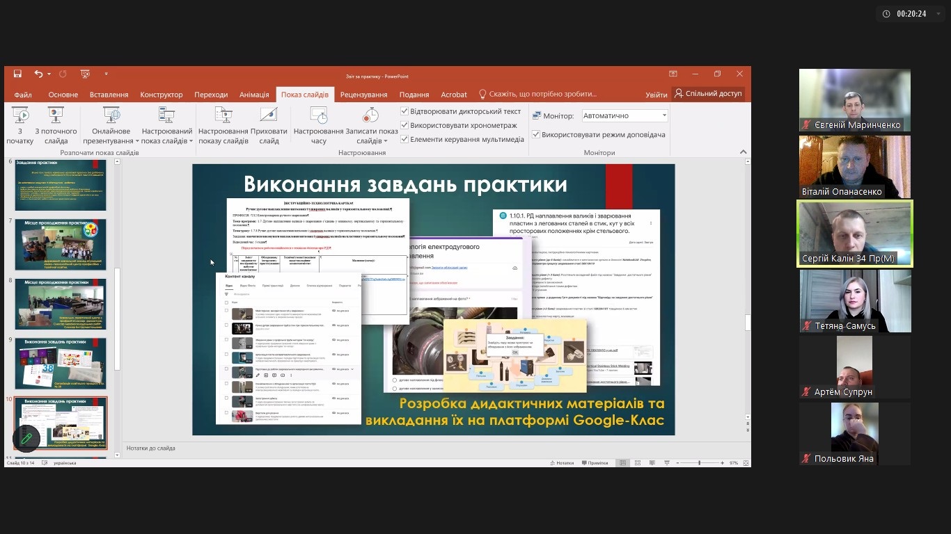 Під час доповідей здобувачі доповіли про індивідуальні особливості проходження практики, набуття досвіду роботи на посаді майстра виробничого навчання, особливості викладання уроків і організації виховної роботи з використанням дистанційних форм навчання. У презентаціях студенти розкрили всі етапи проходження практики, відобразили форми організації навчальної діяльності, методи та засоби навчання, які вони використовували під час проведення уроків виробничого навчання.