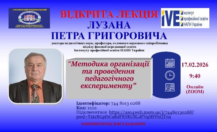 17 лютого 2026 року здобувачі спеціальності А5.37 Професійна освіта (Аграрне виробництво, переробка сільськогосподарської продукції та харчові технології) у межах вивчення освітніх компонентів «Методологія і методи наукових досліджень» (другий – магістерський рівень) та «Основи наукових досліджень» (перший – бакалаврський рівень) долучилися до гостьової лекції Лузана Петра Григоровича – доктора педагогічних наук, професора, головного наукового співробітника відділу фахової передвищої освіти Інституту професійної освіти НАПН України на тему «Методика організації та проведення педагогічного експерименту».