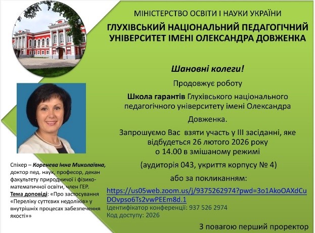 Вже традиційно 26.02.2026 р. викладачі кафедри професійної освіти та технологій сільськогосподарського виробництва взяли участь у засіданні Школи гарантів освітніх програм, що відбулося в Глухівському національному педагогічному університеті імені Олександра Довженка.