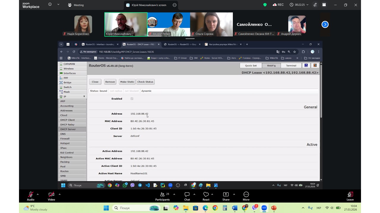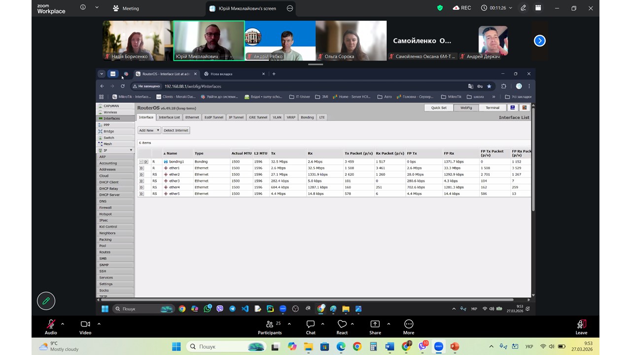 Під час виступу особливу увагу було приділено професійним інструментам адміністрування, зокрема використанню роутерів MikroTik та інтеграції мережевого обладнання Cisco. Юрій Миколайович детально розкрив методику сегментації мережі, що є ключовим фактором підвищення її безпеки та стабільності в умовах інтенсивного навантаження. Слухачі отримали практичні поради щодо налаштування систем, які дозволяють поєднувати різнорідне обладнання в єдиний злагоджений механізм, забезпечуючи безперебійний доступ до інформаційних ресурсів для всіх учасників освітнього процесу.