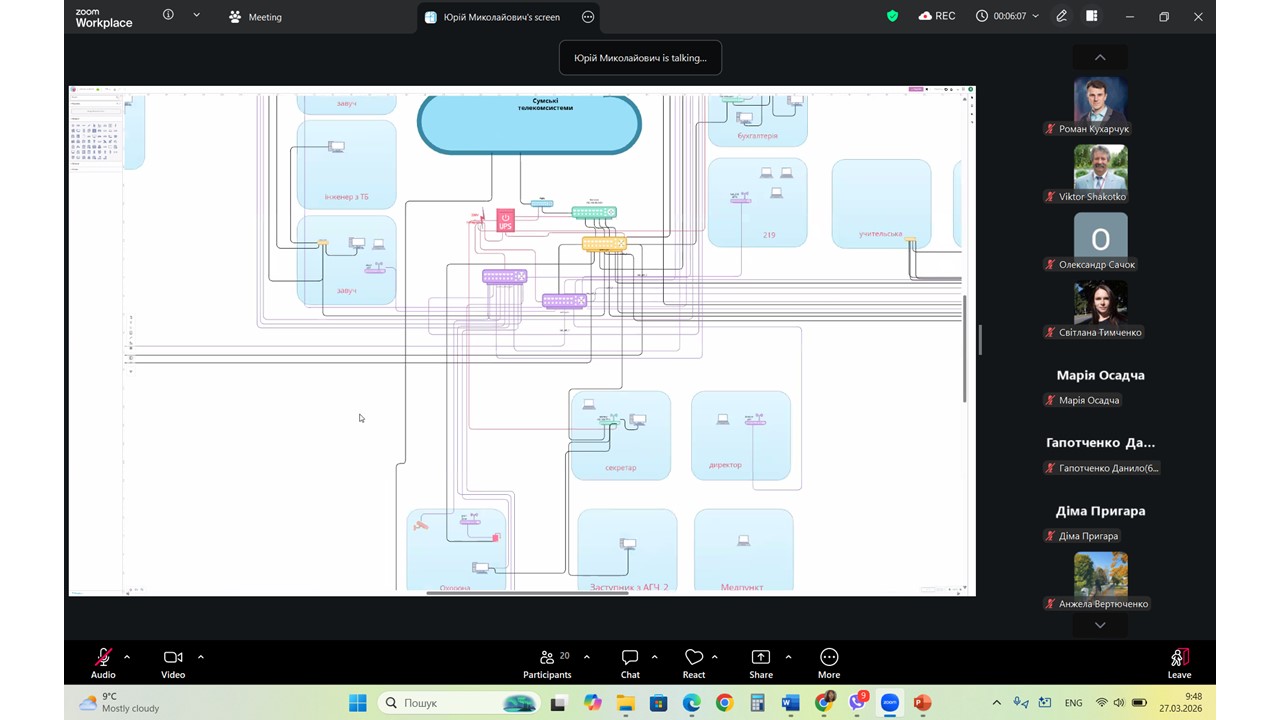 У межах професійної підготовки здобувачів освіти 27.03.2026 р. відбулася гостьова лекція, яку провів вчитель інформатики Сумської школи №29 Чечіль Юрій Миколайович. Тема лекції «Проєктування та побудова комп’ютерної мережі школи». Спікер представив унікальний кейс технічної еволюції освітнього простору: від першого модемного підключення до створення розгалуженої системи за принципом «зірки», що сьогодні охоплює понад 70 приміщень закладу. Цей досвід став яскравим прикладом того, як системний підхід до проєктування дозволяє перетворити обмежені ресурси на надійний цифровий фундамент для навчання.