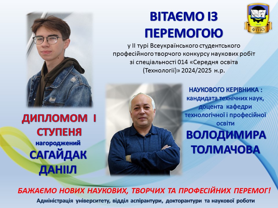 Науково-педагогічний та студентський колективи Глухівського національного педагогічного університету імені Олександра Довженка щиро вітає доктора філософії, доцента кафедри професійної освіти та технологій сільськогосподарського виробництва МАРИНЧЕНКА ЄВГЕНА ОЛЕГОВИЧА з призначенням стипендії Кабінету Міністрів для молодих учених відповідно до Постанови президії Комітету з Національної премії України імені Бориса Патона від 11 листопада 2025 року № 6 «Про призначення стипендій та продовження виплати стипендій Президента України та Кабінету Міністрів України для молодих вчених» з призначенням академічної стипендії Кабінету Міністрів України для молодих вчених!