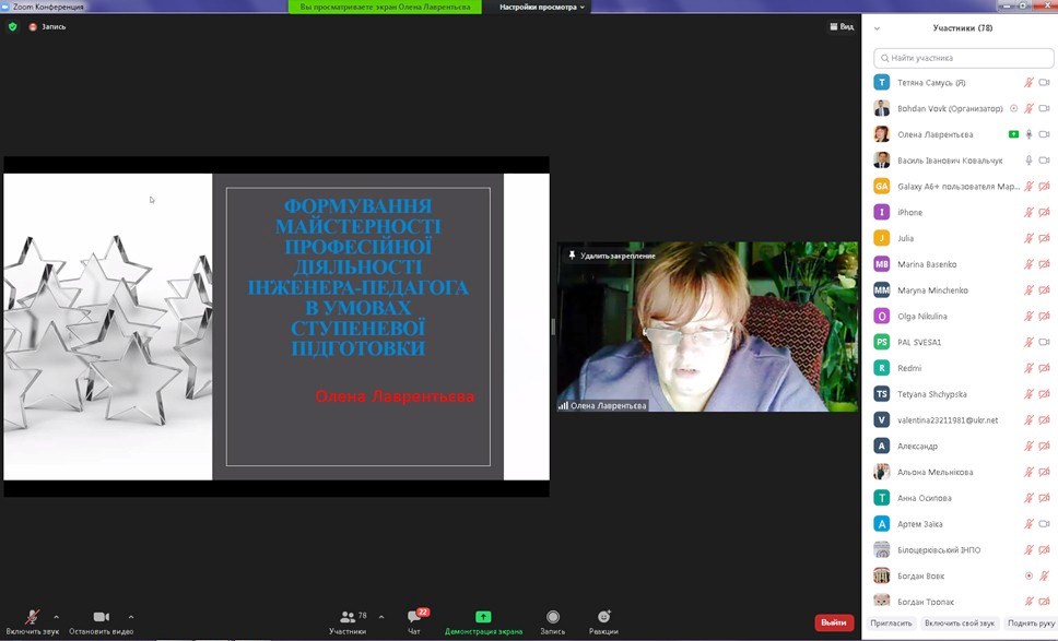 Лаврентьєва Олена Олександрівна, докторка педагогічних наук, професорка кафедри інноваційних технологій з педагогіки, психології та соціальної роботи ЗВО «Університет імені Альфреда Нобеля» у своєму виступі «Формування майстерності професійної діяльності інженера-педагога в умовах ступеневої підготовки» висвітлила питання педагогічної майстерності інженера-педагога. Звернула увагу, що професійна майстерність співвідноситься, проте не тотожна ряду досить важливих понять, серед яких: професіоналізм, професійна компетентність, професійна культура та ін. При цьому професіоналізм, як результат цілеспрямовано організованої продуктивної професійної діяльності, віддзеркалює професійну компетентність і здатність продуктивно вирішувати соціальні, професійні й особистісні завдання, що акумулює в собі життєву й професійну зрілість особистості фахівця. Зі свого боку професійна майстерність є якістю високого ґатунку, вона слугує насамперед джерелом професійної творчості. Її показниками є висока продуктивність і творчий характер, самостійність і культура праці. Досліджуючи напрями формування професійної майстерності інженера-педагога, зазначила доповідачка, доцільно орієнтуватися на модель його діяльності, що містить провідні функції й функціональні ролі, вимоги до спеціаліста, інтегративні професійно значущі якості особистості та будувати цей процес із використанням певних методологічних підходів. Олена Олександрівна відзначила, що тільки з досвідом приходять професійна майстерність і особистісна зрілість, водночас основи професійної майстерності закладаються під час навчання у закладі освіти, серед пріоритетних завдань якого – формування конкурентоздатного фахівця шляхом ефективного поєднання теоретичного й практичного навчання, науково-дослідної діяльності й професійного виховання.