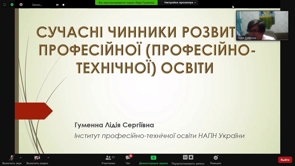 У своєму виступі «Сучасні фактори розвитку професійно-технічної (техніко-технічної) освіти» Гуменна Лідія Сергіївна, молодший науковий співробітник лабораторії зарубіжних систем професійної освіти і навчання Інституту професійно-технічної освіти НАПН України озвучила найістотніші проблеми, що ускладнюють збалансування попиту та пропозиції на національному, регіональних та місцевих ринках праці, серед яких: неефективне багаторівневе управління професійно-технічною освітою, що виявляється у недостатньо чіткому розподілі обов’язків та повноважень щодо управління цією системою; невідповідність якості підготовки випускників закладів професійної (професійно-технічної) освіти вимогам роботодавців; невисокий рівень престижності професійної (професійно-технічної) освіти в Україні; недостатнє фінансування галузі та незначні інвестиції в модернізацію матеріально-технічної бази закладів професійної (професійно-технічної) освіти; невідповідність змісту освіти і методики викладання вимогам ринку праці та потребам особистості; нерозвиненість державно-приватного партнерства у сфері професійно-технічної освіти. Лідія Сергіївна вказала на необхідність персоналізації особистісного підходу залежно від потреб кожного учня. Для цього, на її думку, навчальні курси треба розробляти по-іншому: від самих викладачів не слід вимагати дотримання єдиних стандартів та впровадження відверто стандартизованих підходів. У процесі навчання потрібно частіше застосовувати проєктний, а не предметно орієнтований підхід.
