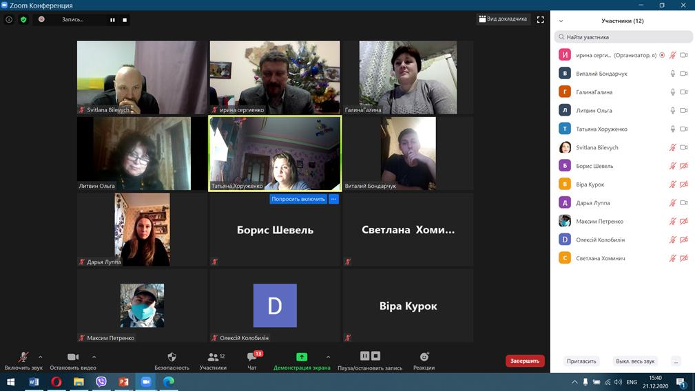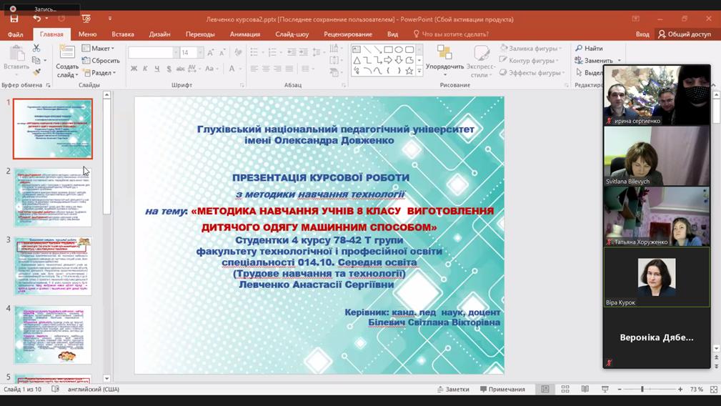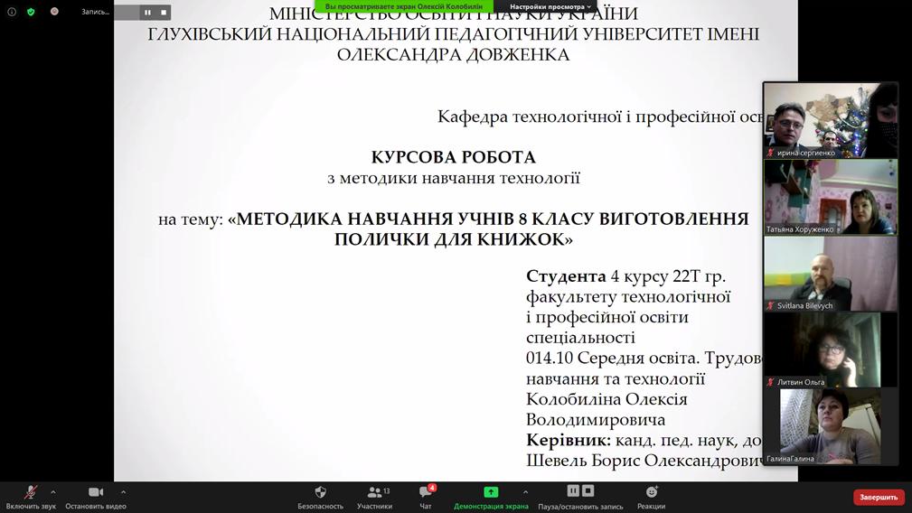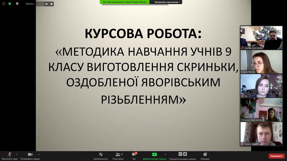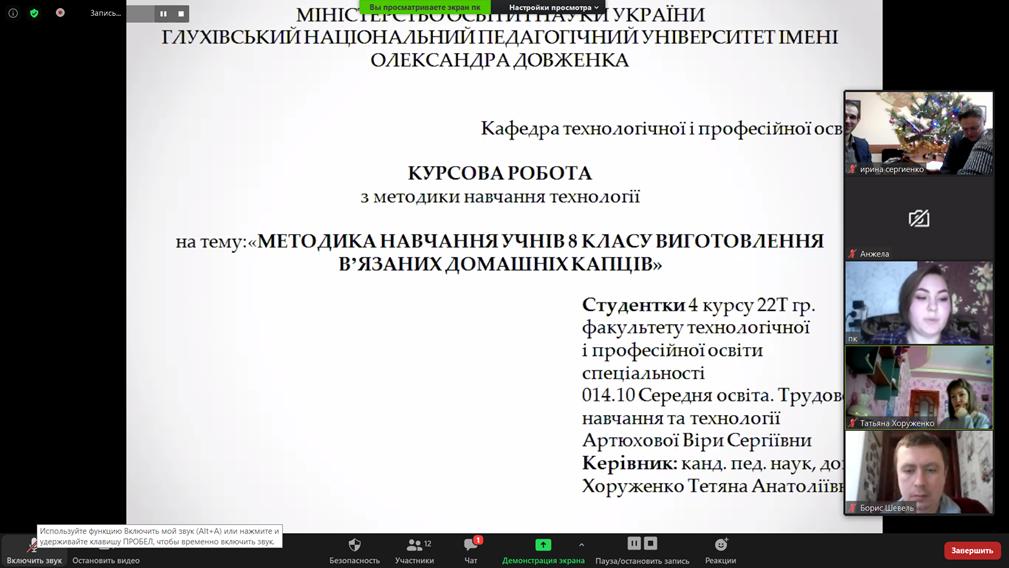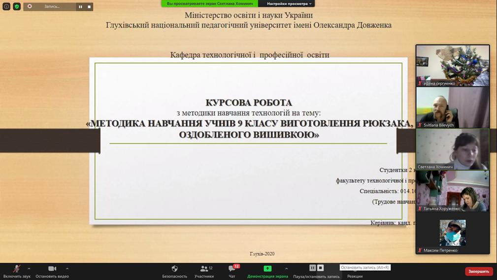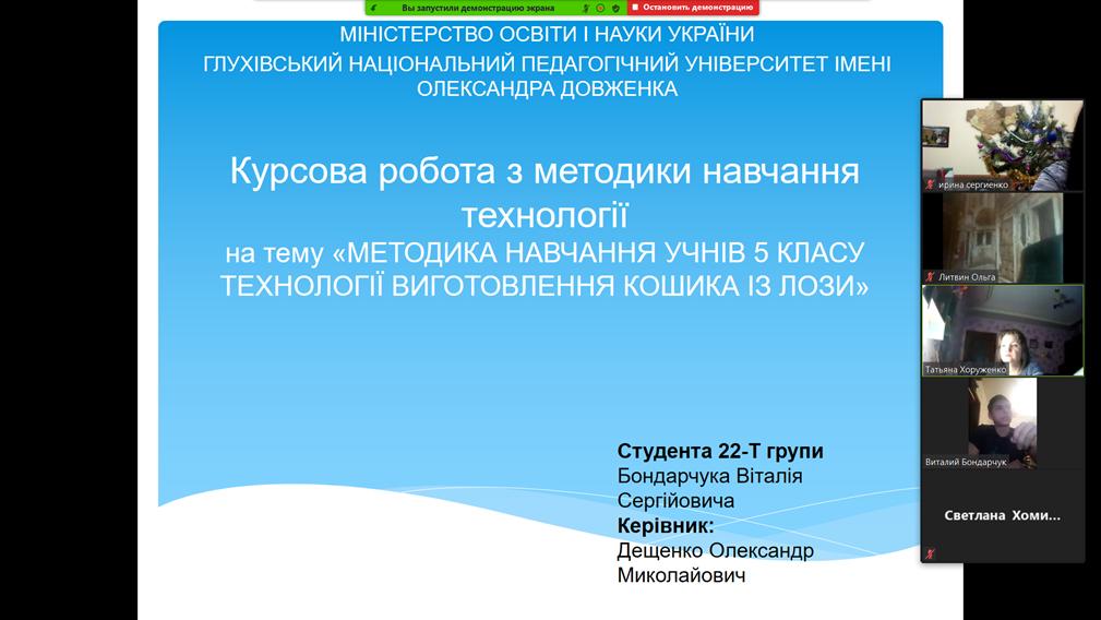 З 21 по 24 грудня на кафедрі технологічної та професійної освіти відбулися захисти курсових робіт з методики навчання технологій студентів денної та заочної форм навчання 22-Т, 41-Т, 70-21Т, 78-42Т та 74-21Т груп факультету технологічної та професійної освіти, що навчаються за освітнім ступенем «Бакалавр». Захист відбувся в форматі он-лайн за допомогою платформи Zoom.