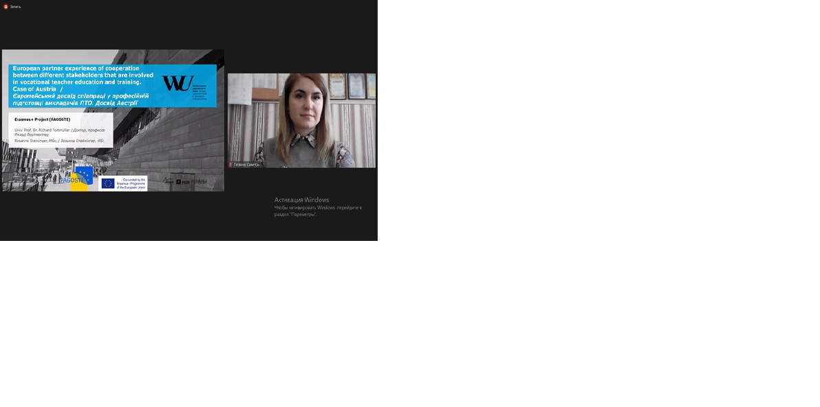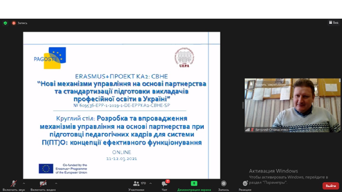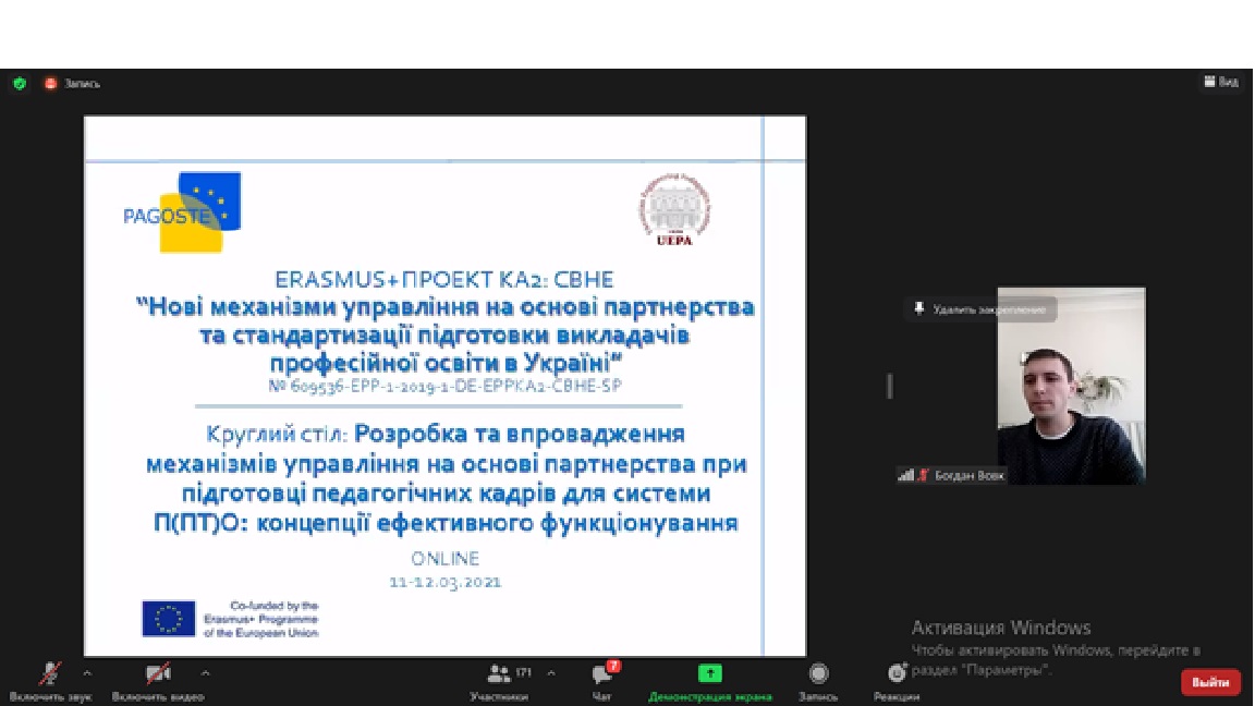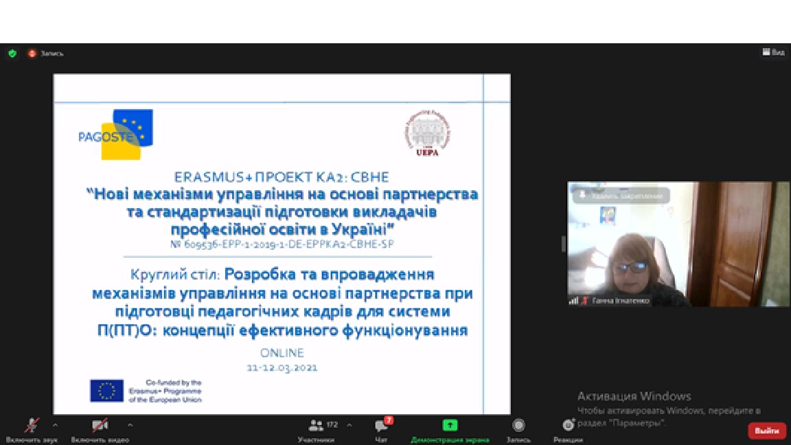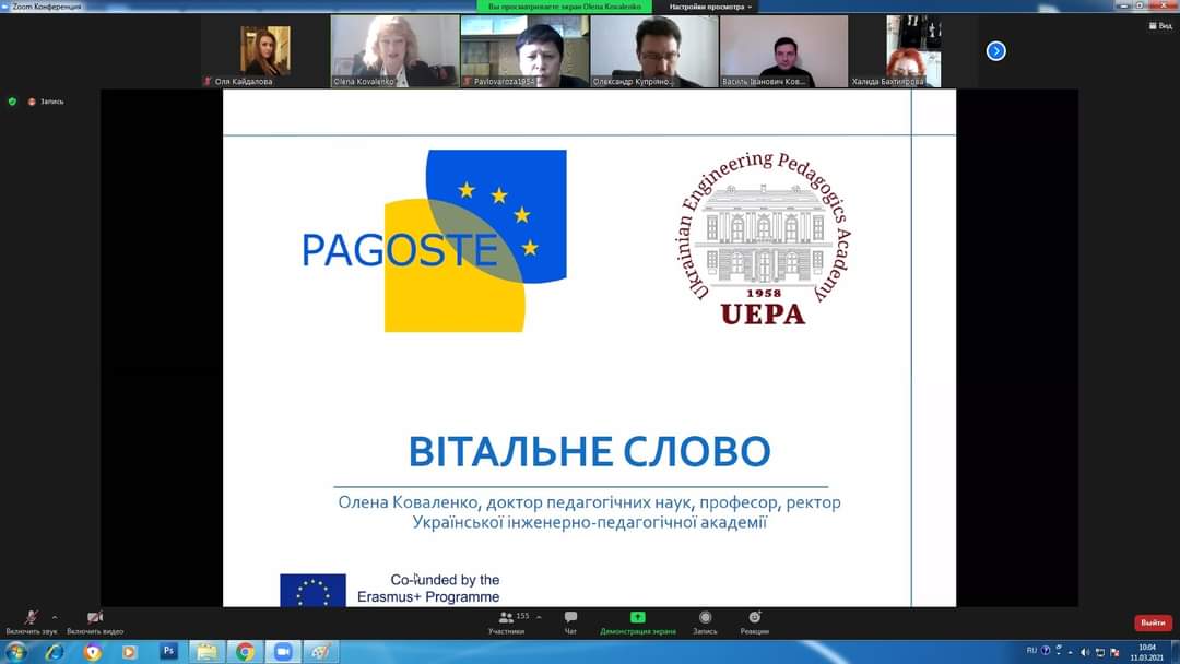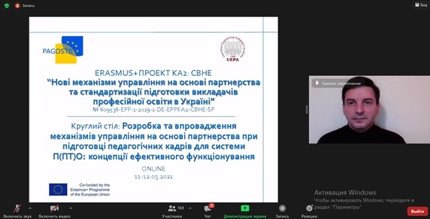 11 та 12 березня 2021 року викладачі КАФЕДРИ ПРОФЕСІЙНОЇ ОСВІТИ ТА ТЕХНОЛОГІЙ СІЛЬСЬКОГОСПОДАРСЬКОГО ВИРОБНИЦТВА взяли участь у роботі міжнародного круглого столу «Розробка та впровадження механізмів управління на основі партнерства при підготовці педагогічних кадрів для системи П(ПТ)О: концепції ефективного функціонування» в рамках міжнародного проєкту Erasmus+ «Нові механізми управління на основі партнерства та стандартизації підготовки викладачів професійної освіти в Україні» (PAGOSTE).