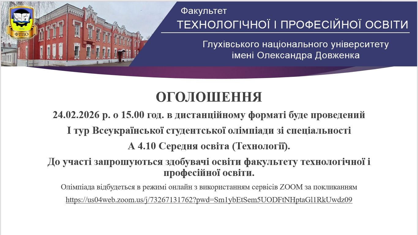 24 лютого 2026 року на факультеті технологічної і професійної освіти Глухівського національного педагогічного університету імені Олександра Довженка в дистанційному форматі відбувся