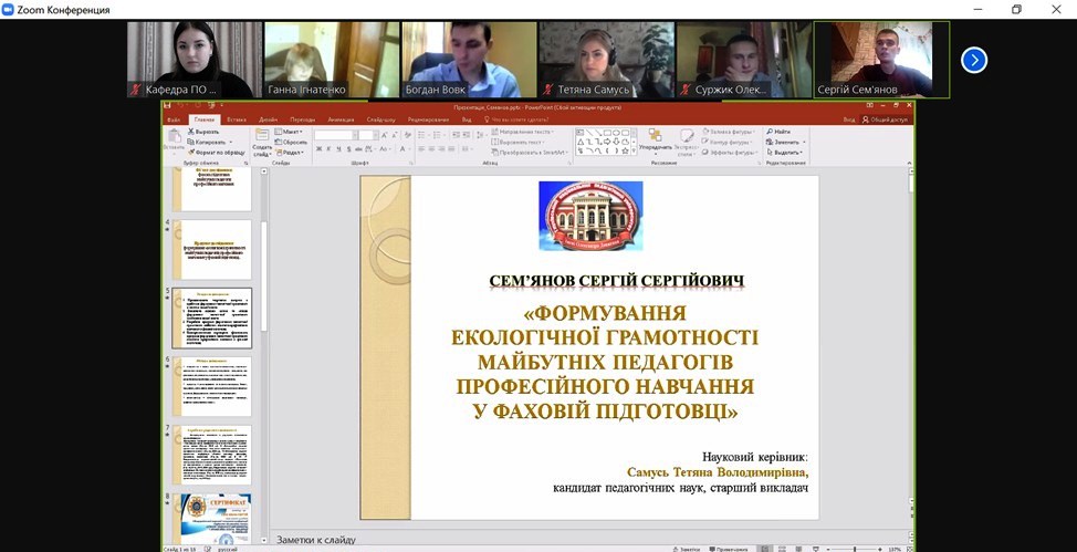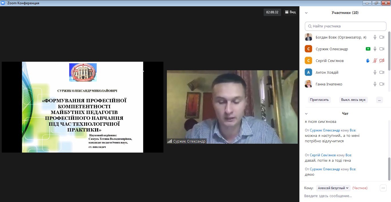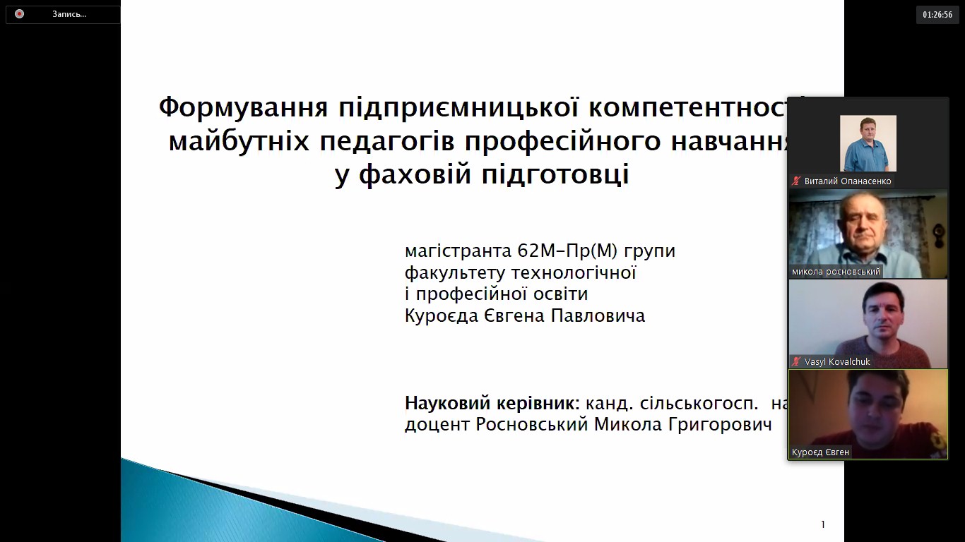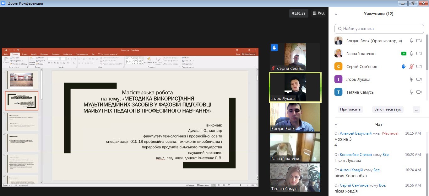 27 листопада 2020 року на кафедрі професійної освіти та технологій сільськогосподарського виробництва в режимі онлайн відбувся попередній захист випускної кваліфікаційної роботи магістрантів другого року навчання за спеціальністю: 015 Професійна освіта (Технологія виробництва і переробки продуктів сільського господарства).