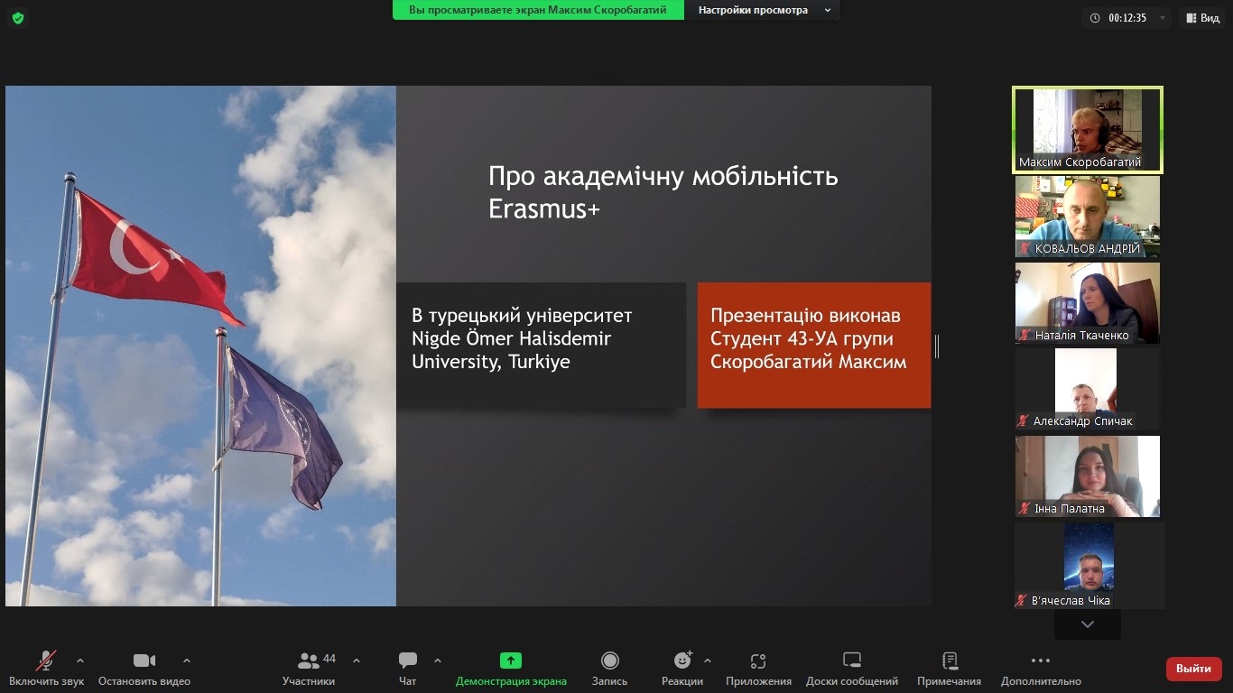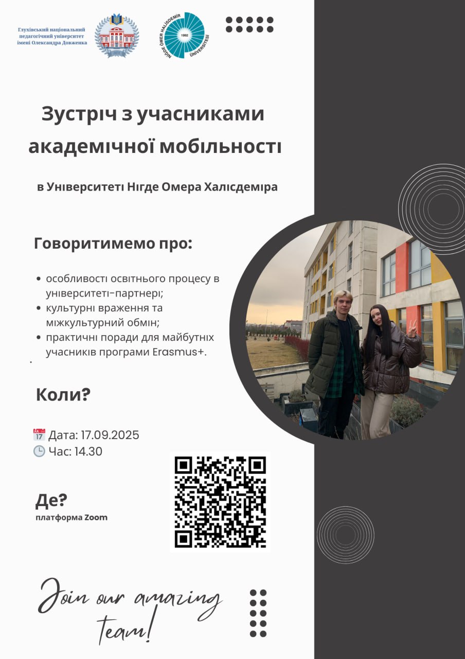 З метою інформування та розширення знань здобувачів освіти спеціальності А5.37 «Професійна освіта (Аграрне виробництво, переробка сільськогосподарської продукції та харчові технології)» про можливості міжнародної академічної мобільності 17 вересня 2025 року в Глухівському НПУ імені Олександра Довженка відбулася онлайн-зустріч з учасниками програми Erasmus+, які навчалися в Університеті Нігде Омера Халісдеміра (Туреччина).