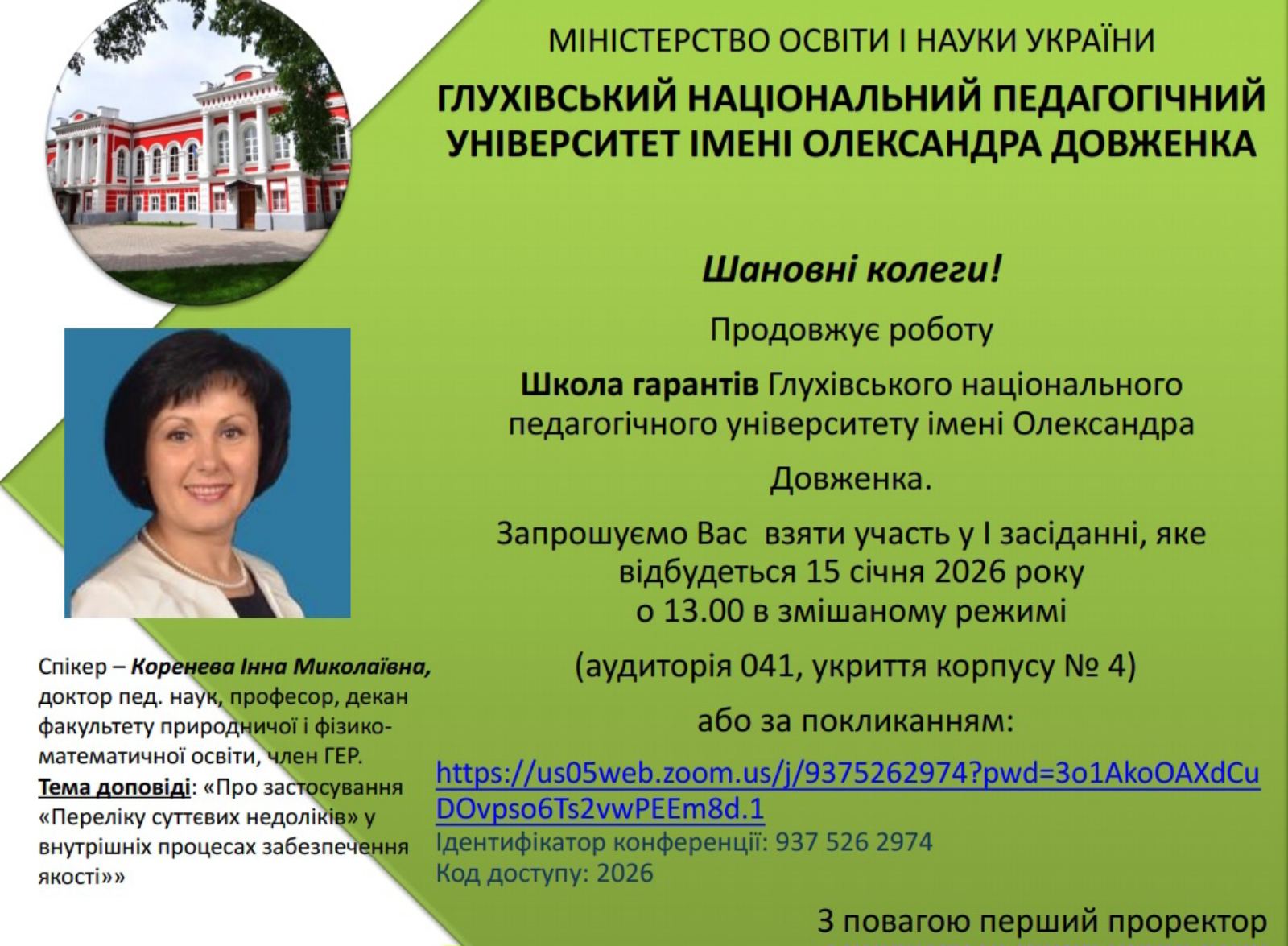 Кафедра професійної освіти та технологій сільськогосподарського виробництва продовжує активну участь у роботі Школи гарантів Глухівського національного педагогічного університету імені Олександра Довженка. Перше засідання у 2026 році відбулося 15 січня в змішаному форматі та було присвячене актуальним питанням внутрішнього забезпечення якості освітніх програм. Зокрема, учасники розглянули особливості застосування «Переліку суттєвих недоліків» під час оцінювання відповідності освітніх програм установленим критеріям якості.