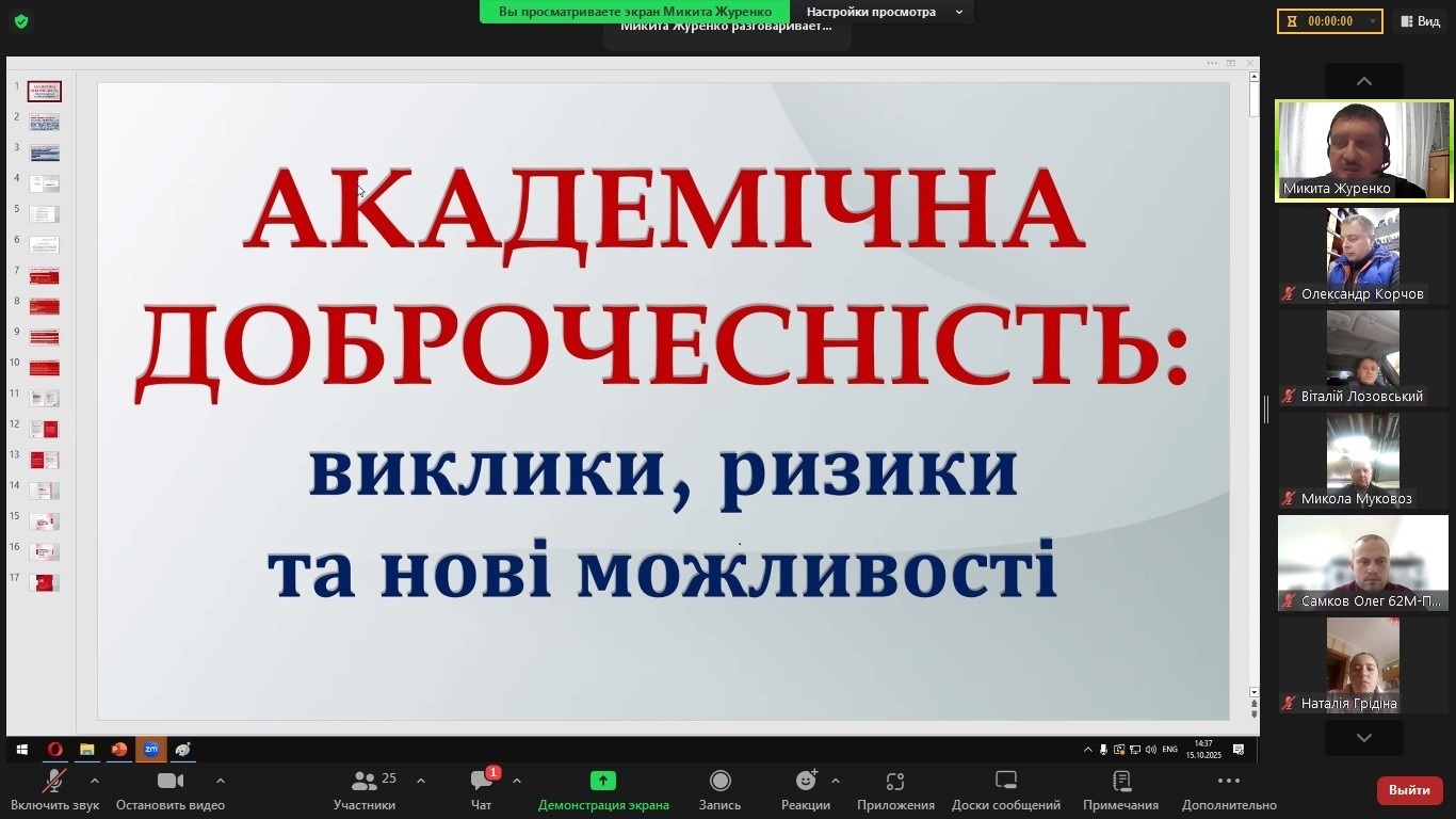 15 жовтня 2025 року студенти спеціальності А5.37 Професійна освіта (Аграрне виробництво, переробка сільськогосподарської продукції та харчові технології) долучилися до участі у вебінарі «Академічна доброчесність: виклики, ризики та нові можливості», який відбувся в онлайн-форматі.