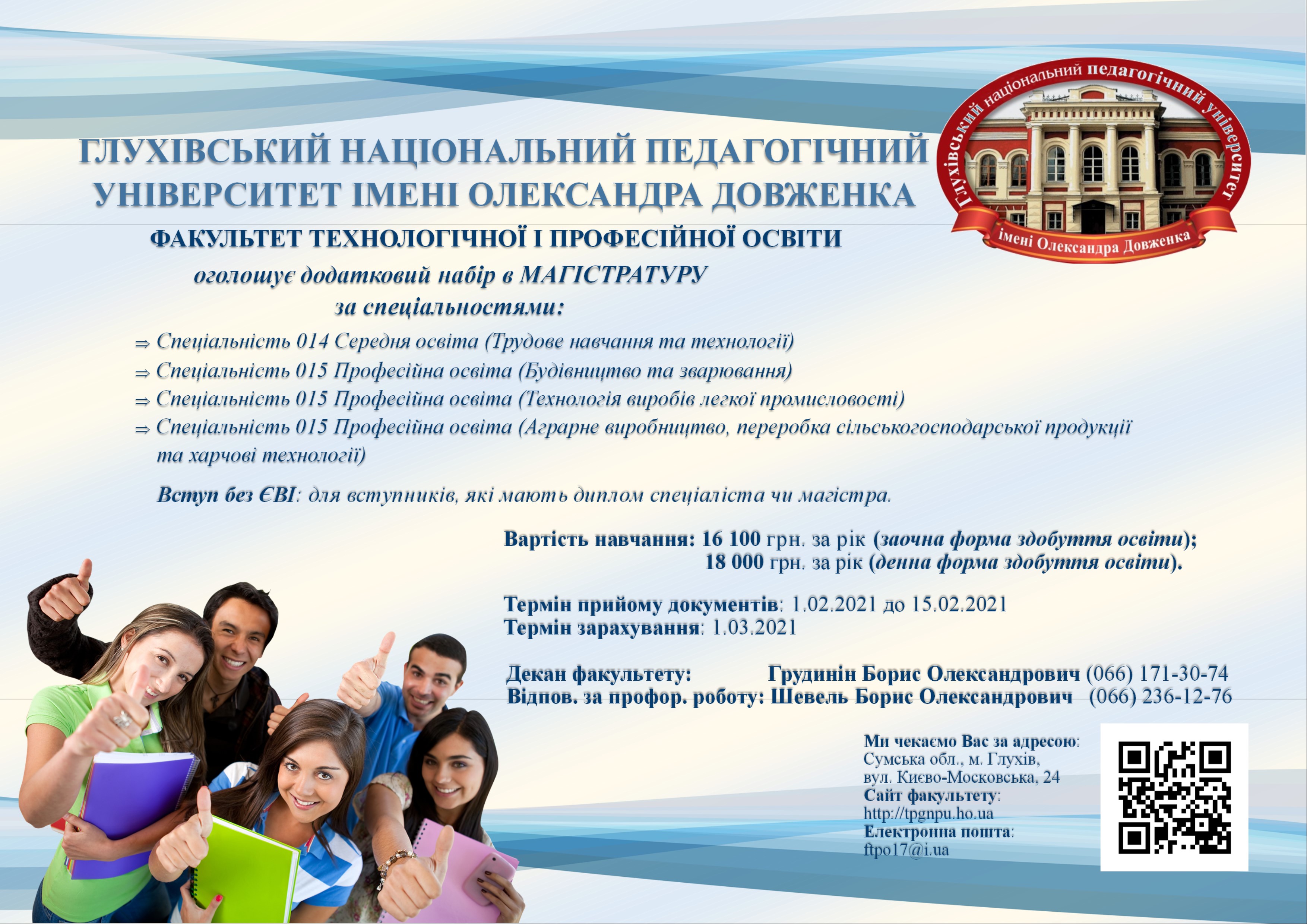 УВАГА! На виконання рішення вченої ради Глухівського НПУ ім. О. Довженка (протокол № 10 від 03.02. 2021 р.) 19 лютого 2021 року о 9.30 год. в ауд. 59 (центральний корпус) на розширеному засіданні кафедри професійної освіти та технологій сільськогосподарського виробництва відбудеться фаховий семінар для апробації дисертації Бикової Тетяни Борисівни на тему: «Професійна підготовка майстрів виробничого навчання швейного профілю із застосуванням змішаного навчання» на здобуття ступеня доктора філософії з галузі знань 01 Освіта за спеціальністю 015 Професійна освіта. Науковий керівник – доктор педагогічних наук, професор Ковальчук Василь Іванович.