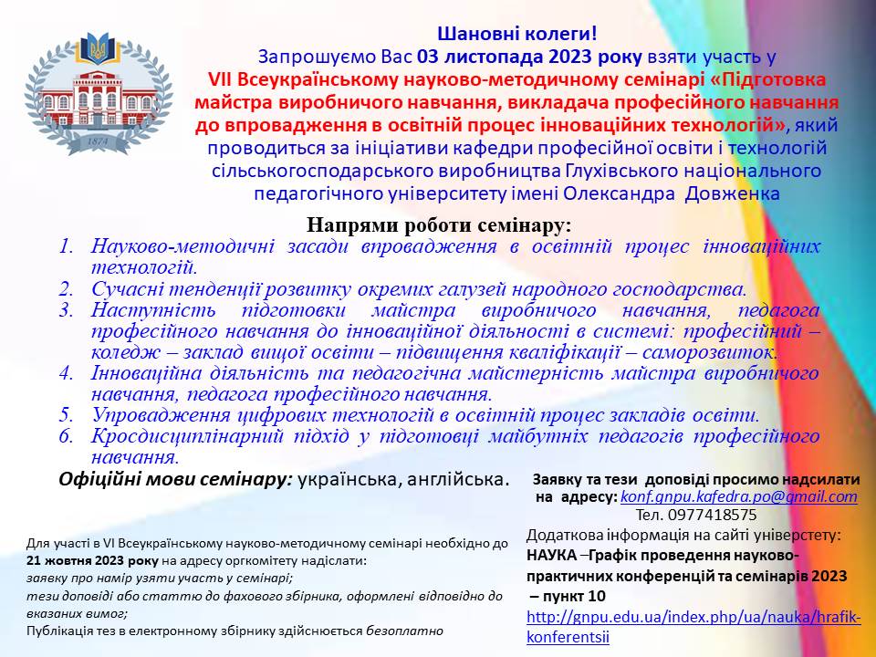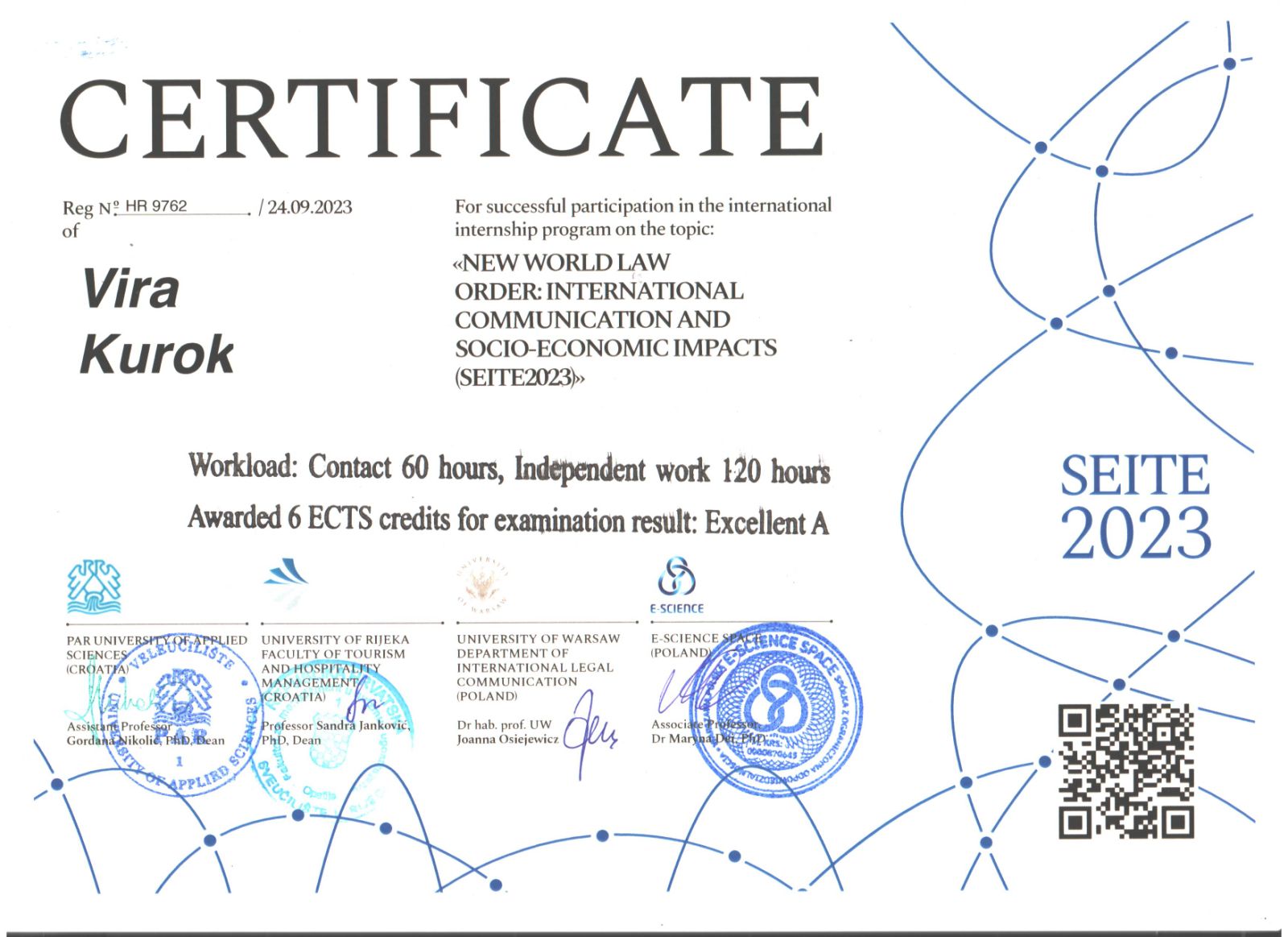 Завідувач кафедри технологічної і професійної освіти, доктор педагогічних наук, професор, член-кореспондент НАПН України Курок Віра Панасівна упродовж червня-вересня 2023 р. проходила міжнародне стажування, підсумком якого стала VІ Міжнародна науково-практична конференція «Новий світовий правопорядок: міжнародна комунікація та соціально-економічний вплив» (16.09 – 24.09.2023 р.) за участю країн: Хорватія, Польща, Україна.